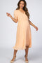 A solid chiffon, swiss dot short sleeve midi dress. Features ruffle trim on v-neckline and sleeves. Dress is double lined.