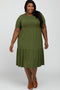 A solid ribbed short sleeve plus dress with scoop neckline and tiered body.