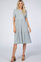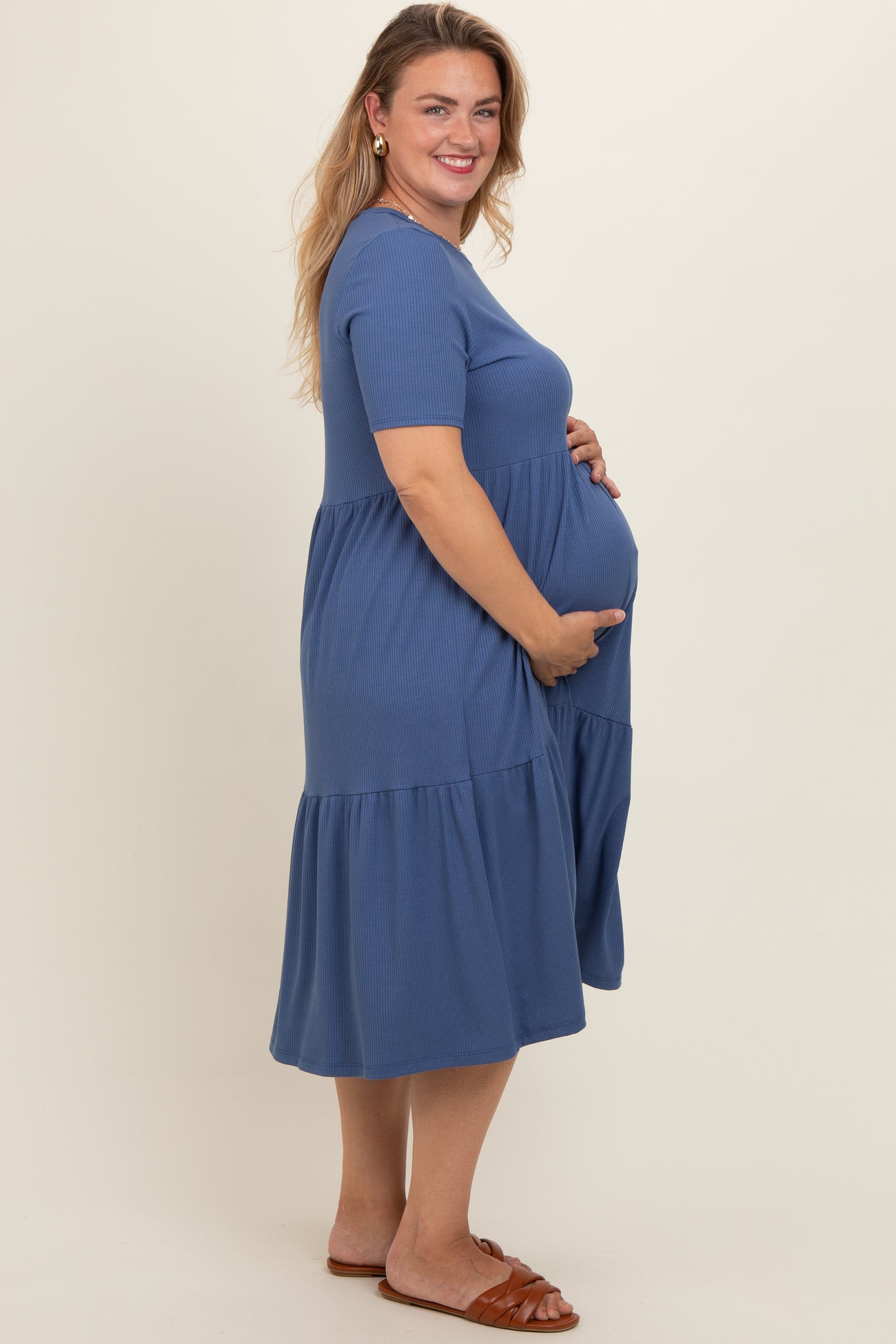 A solid ribbed short sleeve maternity plus dress with scoop neckline and tiered body.