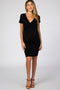 An ultra soft, knit maternity/nursing fitted dress featuring a v-neckline with a wrap front and side tie detailing for easy access. Also features short length sleeves.