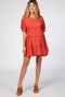 A solid hued mini dress featuring a tiered body, short sleeves, ruffle accents and a rounded neckline.