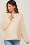 An open knit maternity sweater featuring top front functioning buttons, a ribbed rounded neckline, and long raglan sleeves.