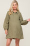 A solid hue maternity dress featuring long raglan sleeves, a collar, functioning front buttons, and side pockets. Dress is lined for coverage.