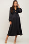 A solid satin midi dress with long sleeves. Features cutout bow tie front on bust. Hook eye zipper closure in back.