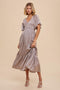 Step into effortless elegance with our Camel Satin Smocked Midi Dress. Crafted from smooth satin fabric, this dress features a flattering smocked bodice that hugs your shape while offering comfortable stretch. The deep V-neckline and flutter sleeves add a feminine touch, making it perfect for both day and evening occasions. The flowing midi skirt with a tiered hem creates graceful movement with every step. Pair it with ankle boots or heels for a chic, polished look. Whether you're dressing up or keeping it casual, this versatile camel dress is a must-have for your wardrobe.