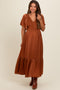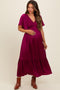 A solid satin maternity midi dress featuring short sleeves, a smocked top and a ruffle hem. Skirt is double lined.