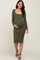 A solid hued maternity dress featuring long sleeves and a square neckline.