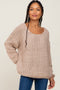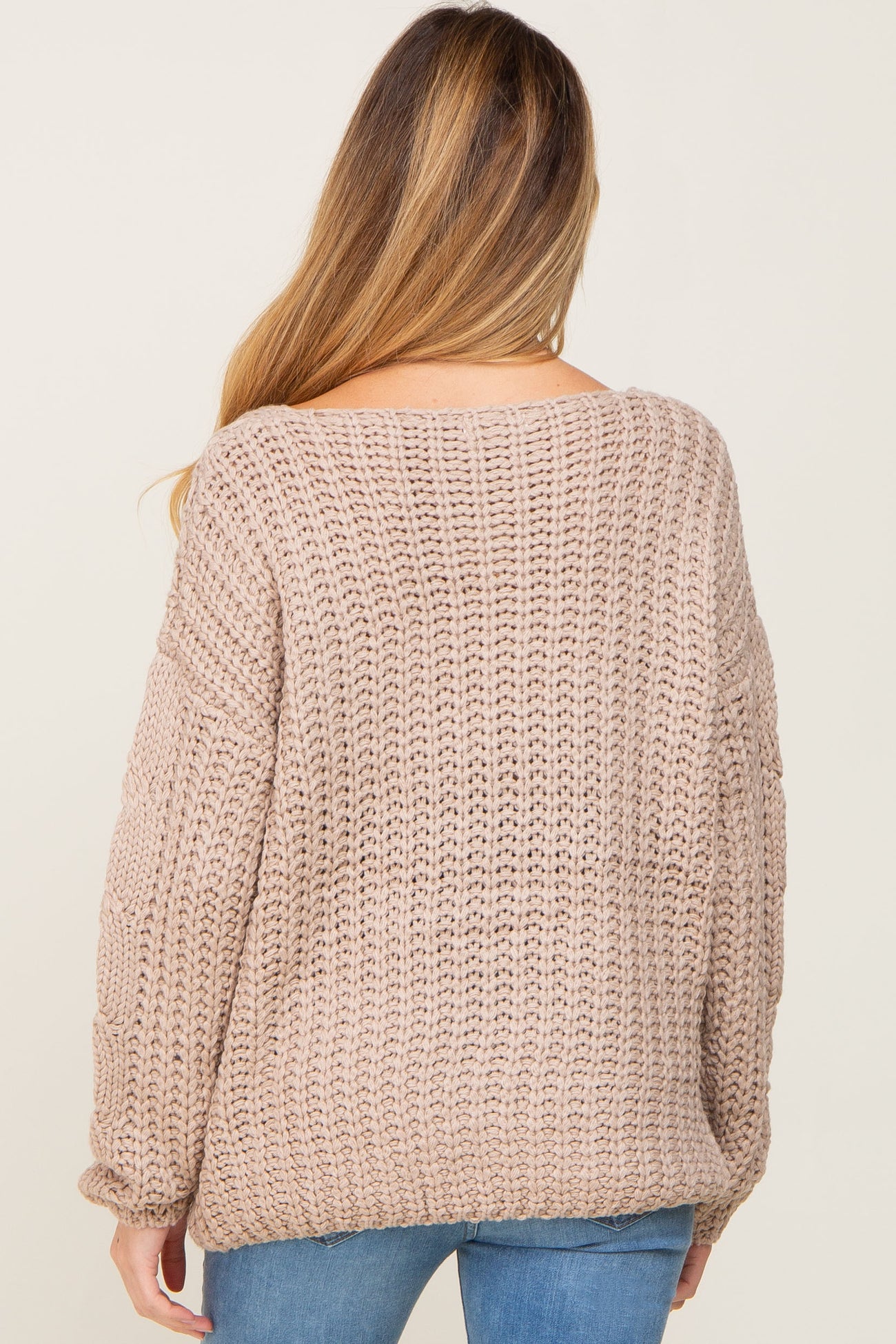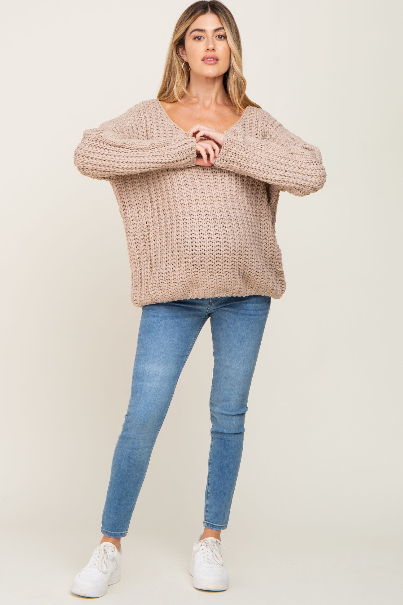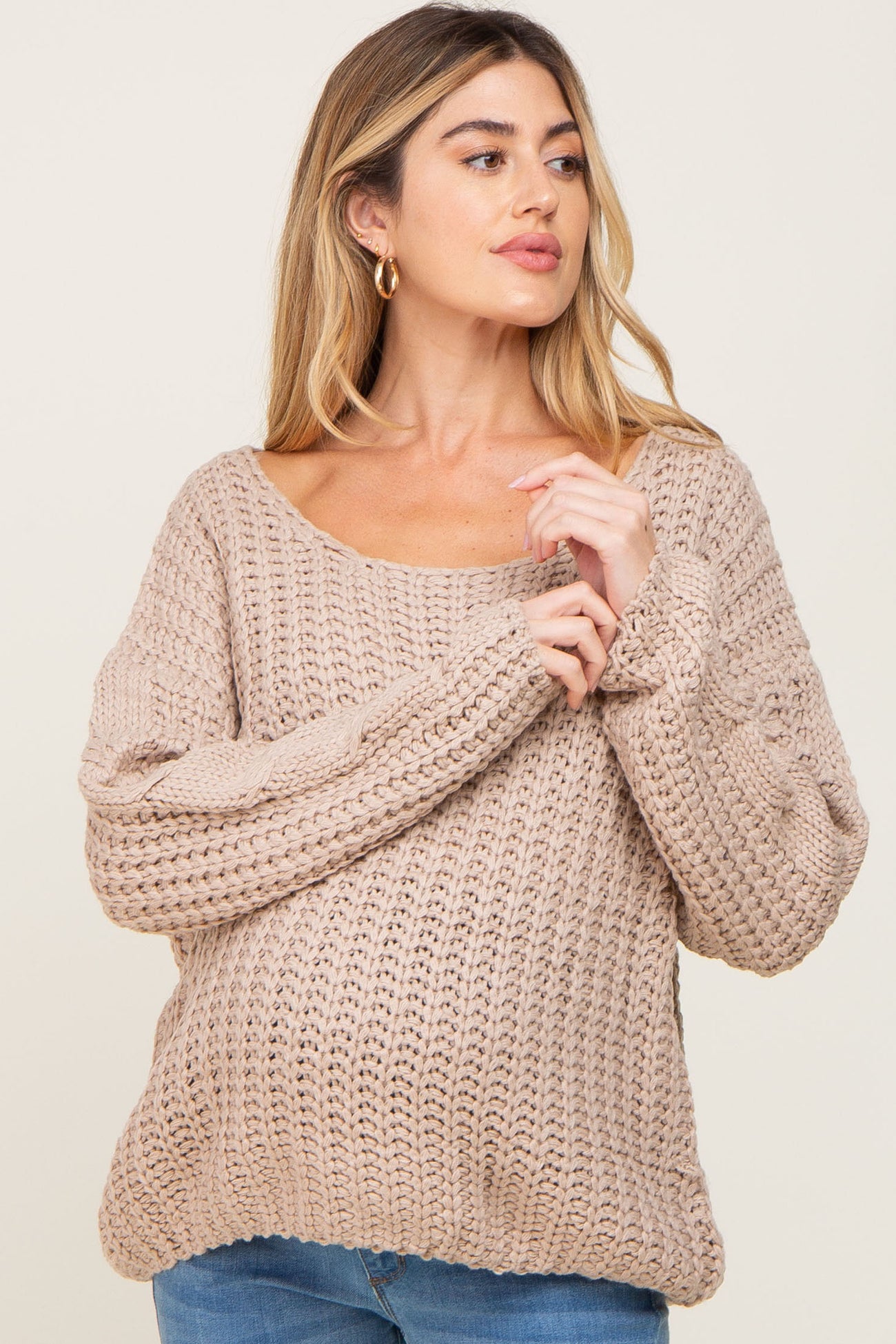 A solid chunky knit maternity sweater with a low round neckline and dropped shoulders.