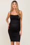 A fitted maternity midi dress featuring ruched mesh, a square neckline, adjustable cami straps.