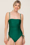 A solid hued one-piece swimsuit featuring ruched front ties at hips that can be adjusted, a square neckline, adjustable straps, removeable padded cups, built in bra, metal buckle clasp closure, U shaped cutout on back, and a double lining.