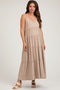 A solid hue maternity maxi dress featuring adjustable straps, a v-neckline, side pockets, and a tiered body.