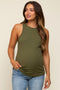 A basic solid maternity tank top in a ribbed material with a higher neckline and rounded hem.