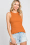 A basic solid tank top in a ribbed material with a higher neckline and rounded hem.