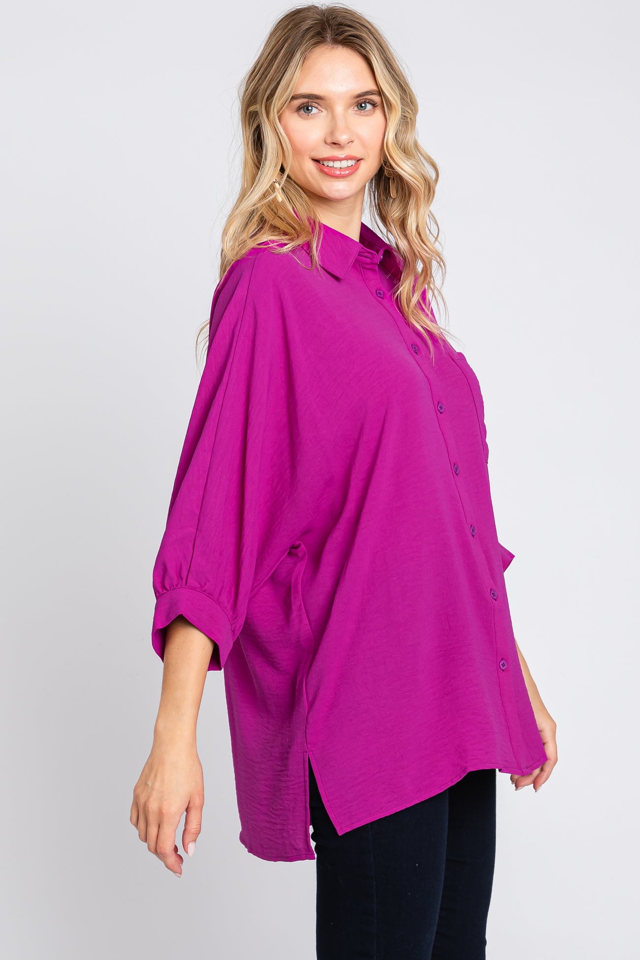 Details A solid button-down top featuring a collar, 3/4 length dolman sleeves, a front pocket, side slits, and a hi-lo hem. Content + Care