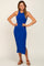 A solid sleeveless knit midi dress with cross detail and sash tie in back.