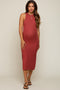 A solid ribbed sleeveless maternity dress featuring side slits and a rounded neckline.