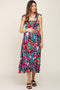 A printed midi with adjustable shoulder ties, a smocked bodice, and a lined skirt.