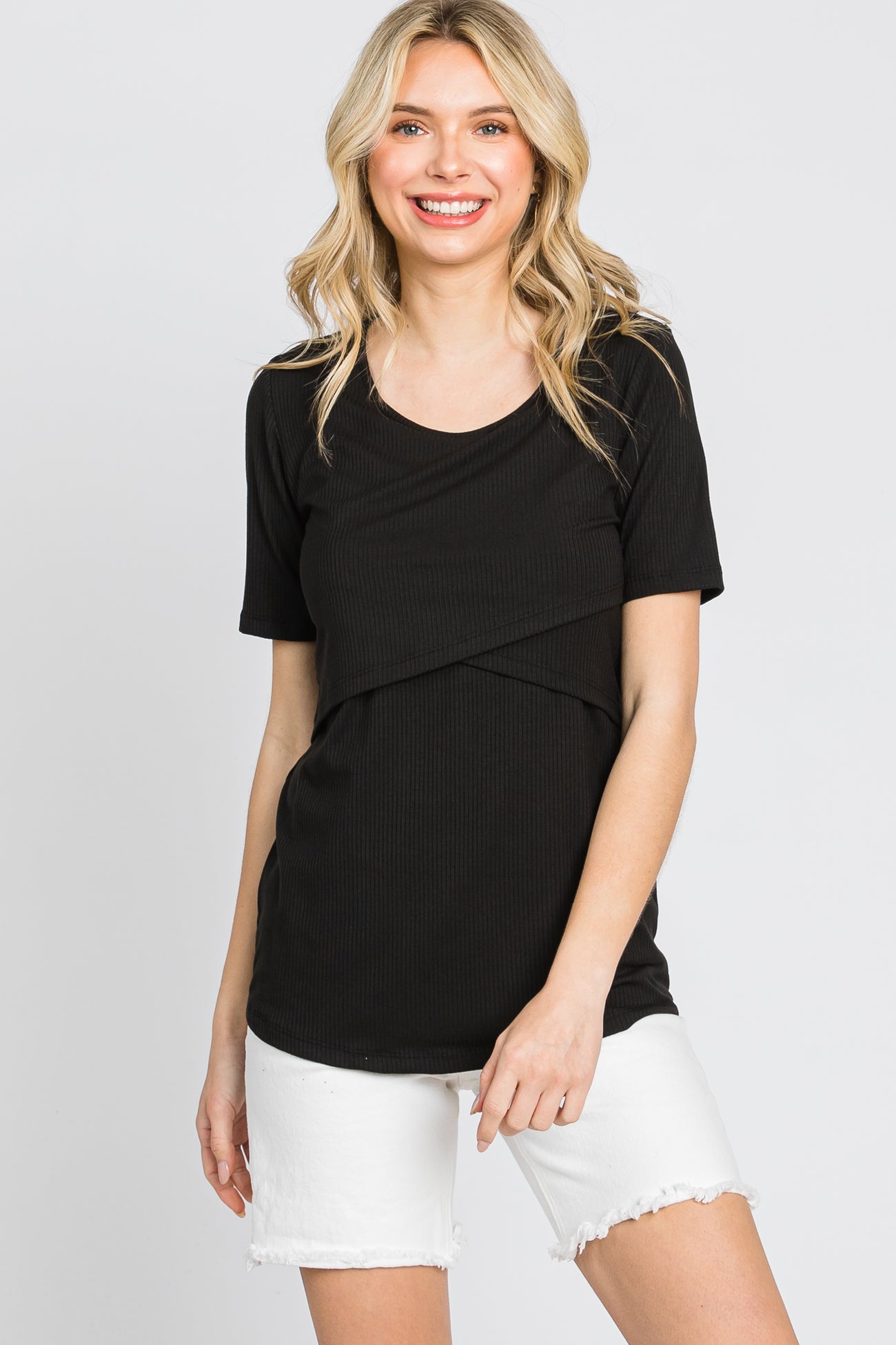 A ribbed knit nursing top featuring a rounded neckline, short sleeves, a wrap front and easy access for nursing.