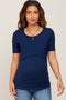 A ribbed knit maternity nursing top featuring a rounded neckline, short sleeves, a wrap front and easy access for nursing.