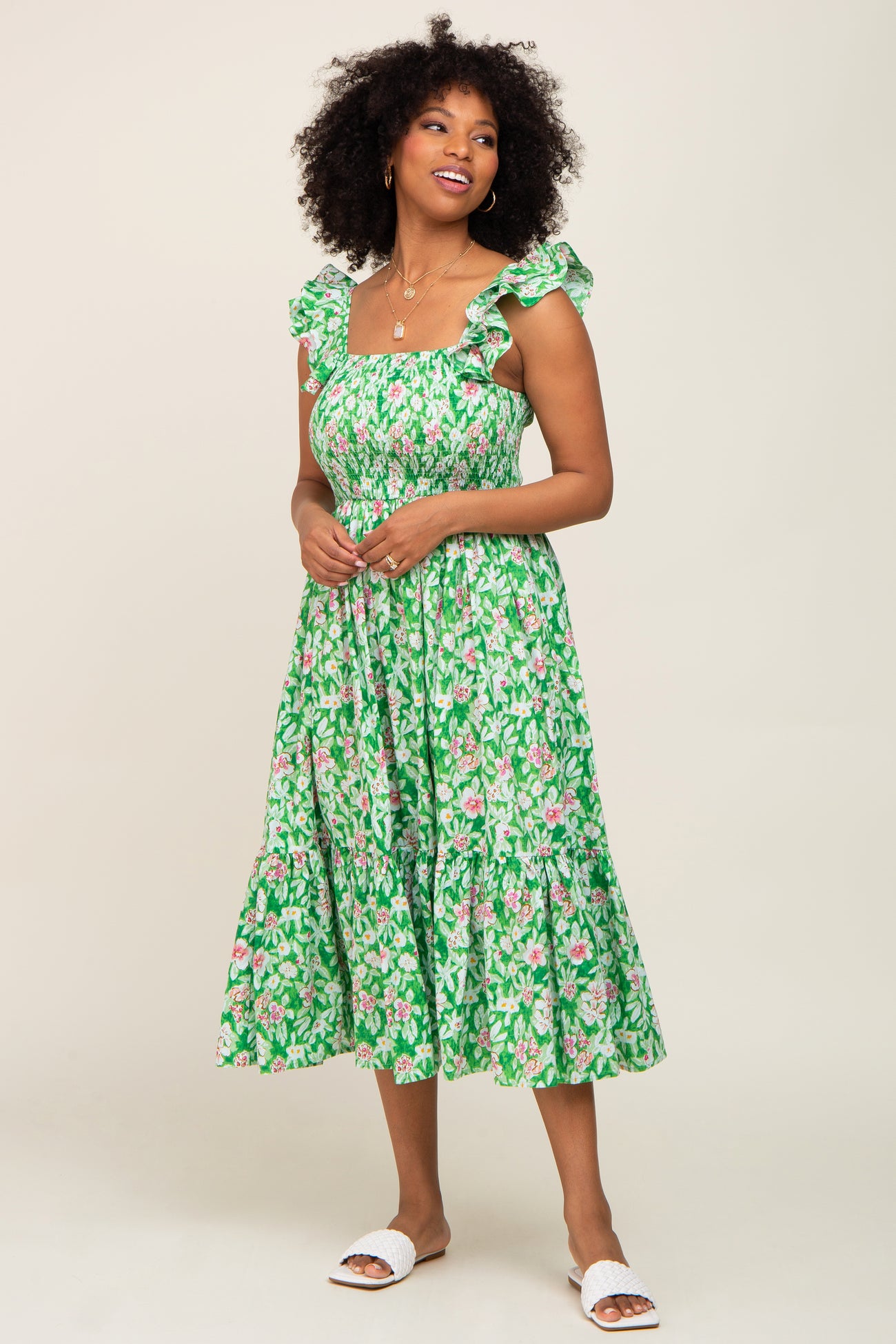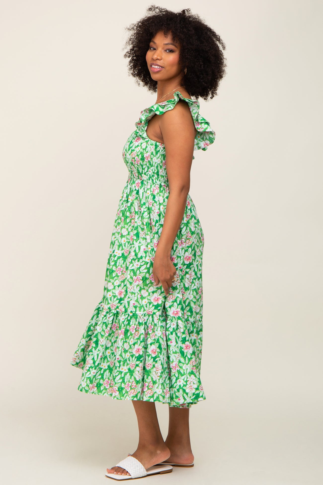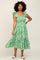 Green Floral Smocked Frill Sleeve Midi Dress
