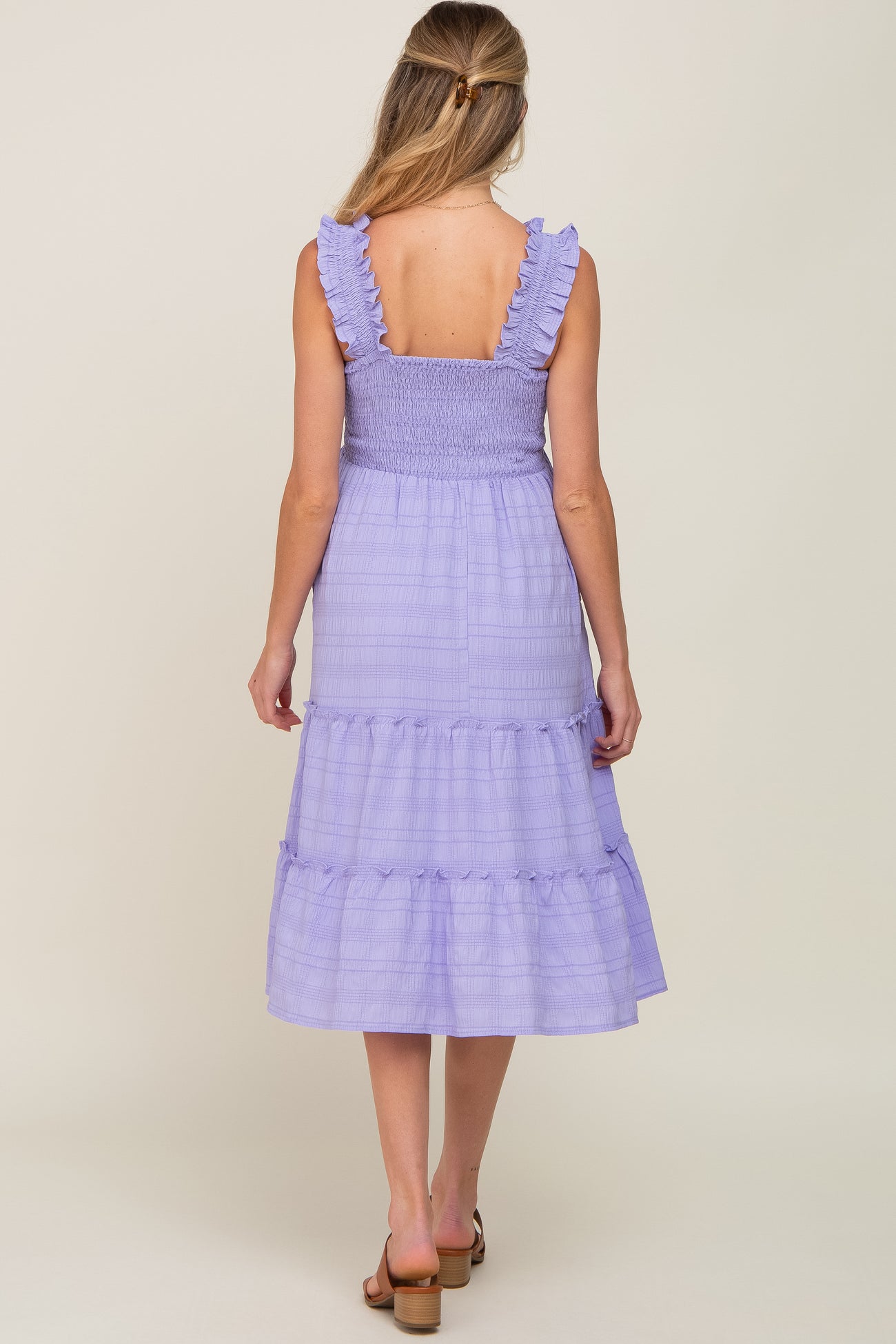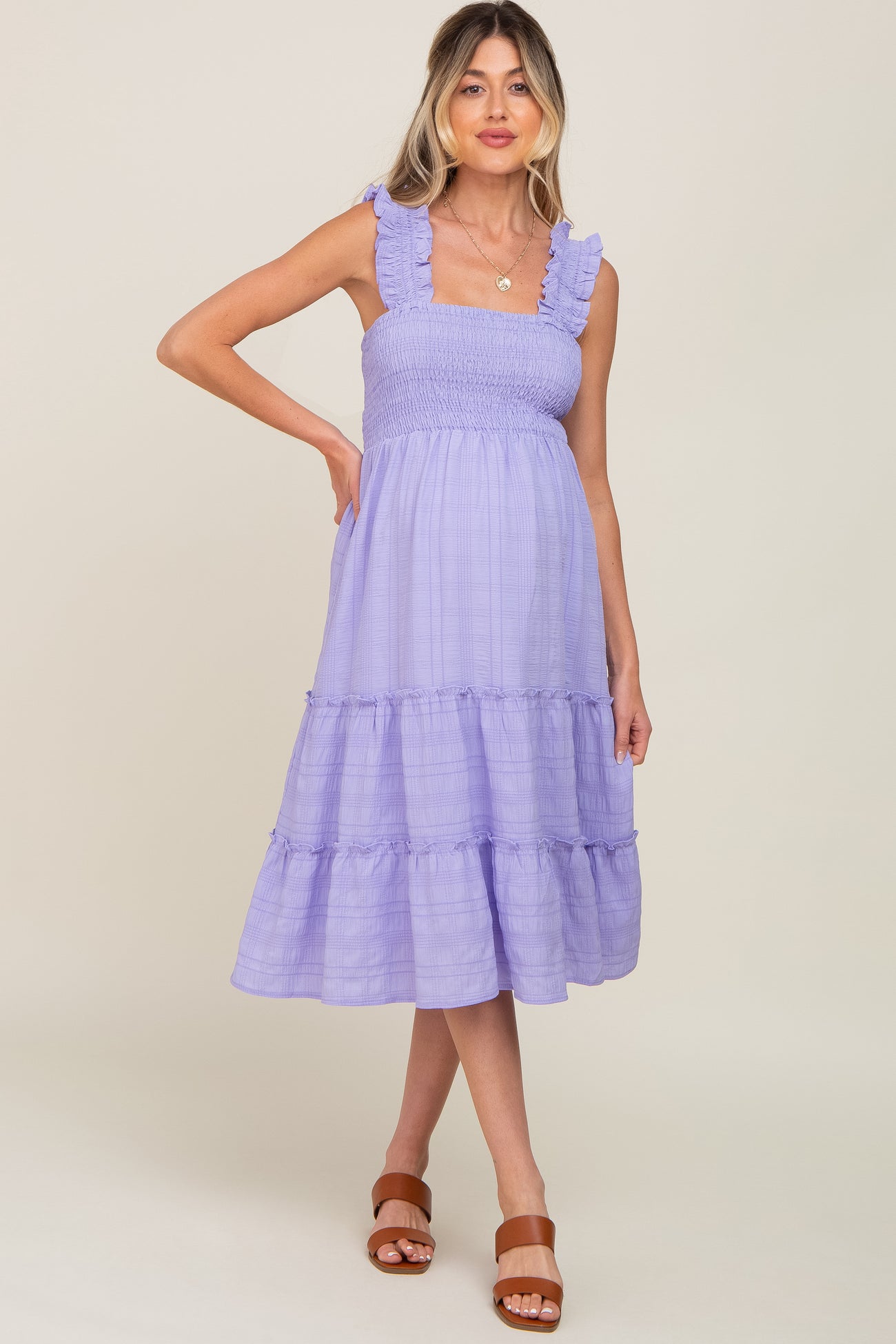 Lavender Smocked Square Neck Ruffle Strap Tiered Maternity Midi Dress