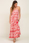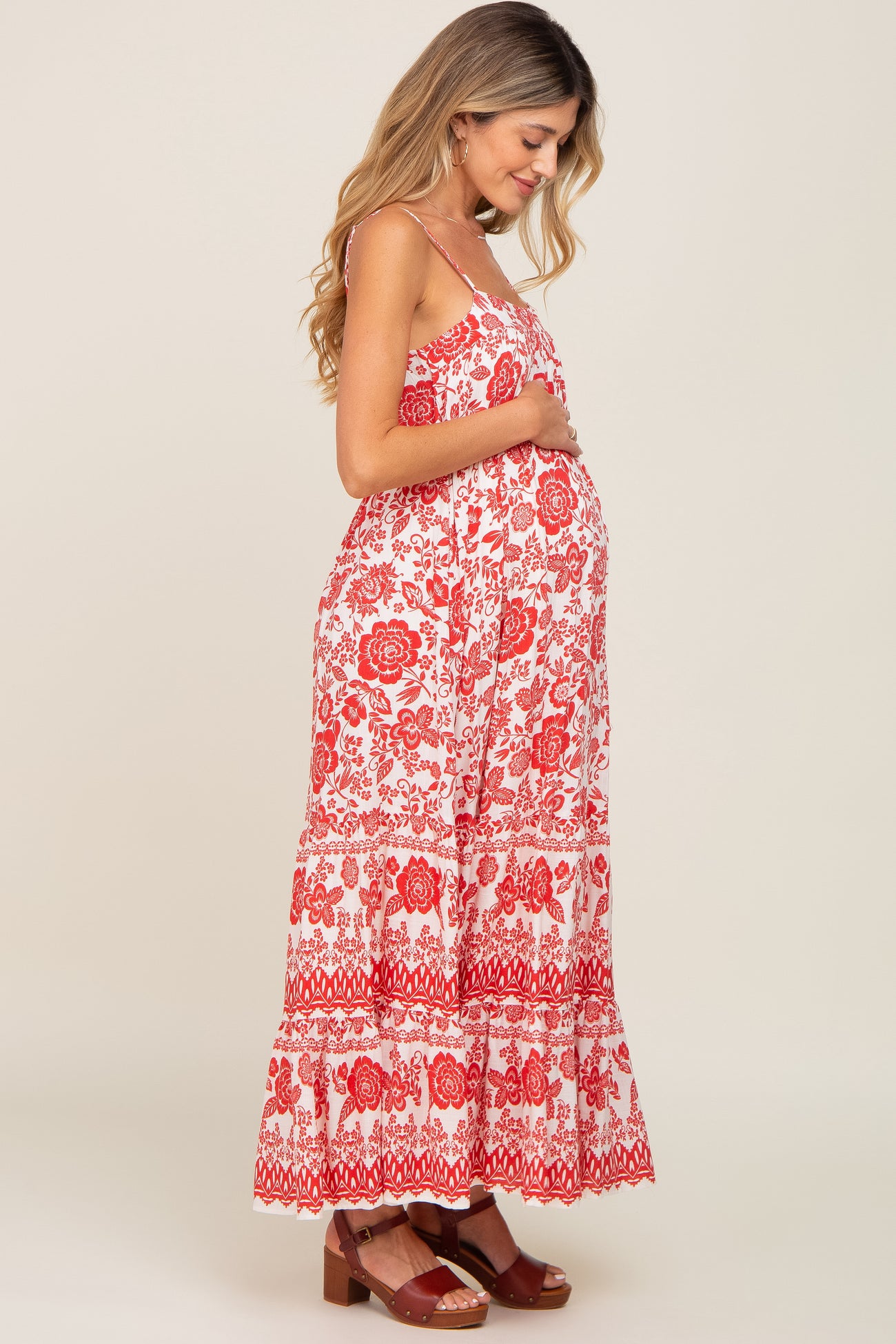 A floral printed maternity maxi dress featuring a square neckline, adjustable cami straps, an adjustable tie at the waist a tiered hem and double lining.