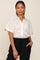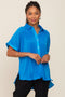 A button up with a collar, a pleated body, short dolman sleeves, side slits, and a hi-lo hem. Satin accents featured along the collar, button placket, and cuffed sleeves.
