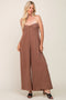 A knit jumpsuit that is strapless with a sweetheart neckline, front twist top, a smocked back, side pockets, and wide leg pants.
