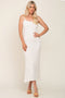 An open knit crochet maternity dress featuring adjustable straps and a scoop neckline. Dress is lined.