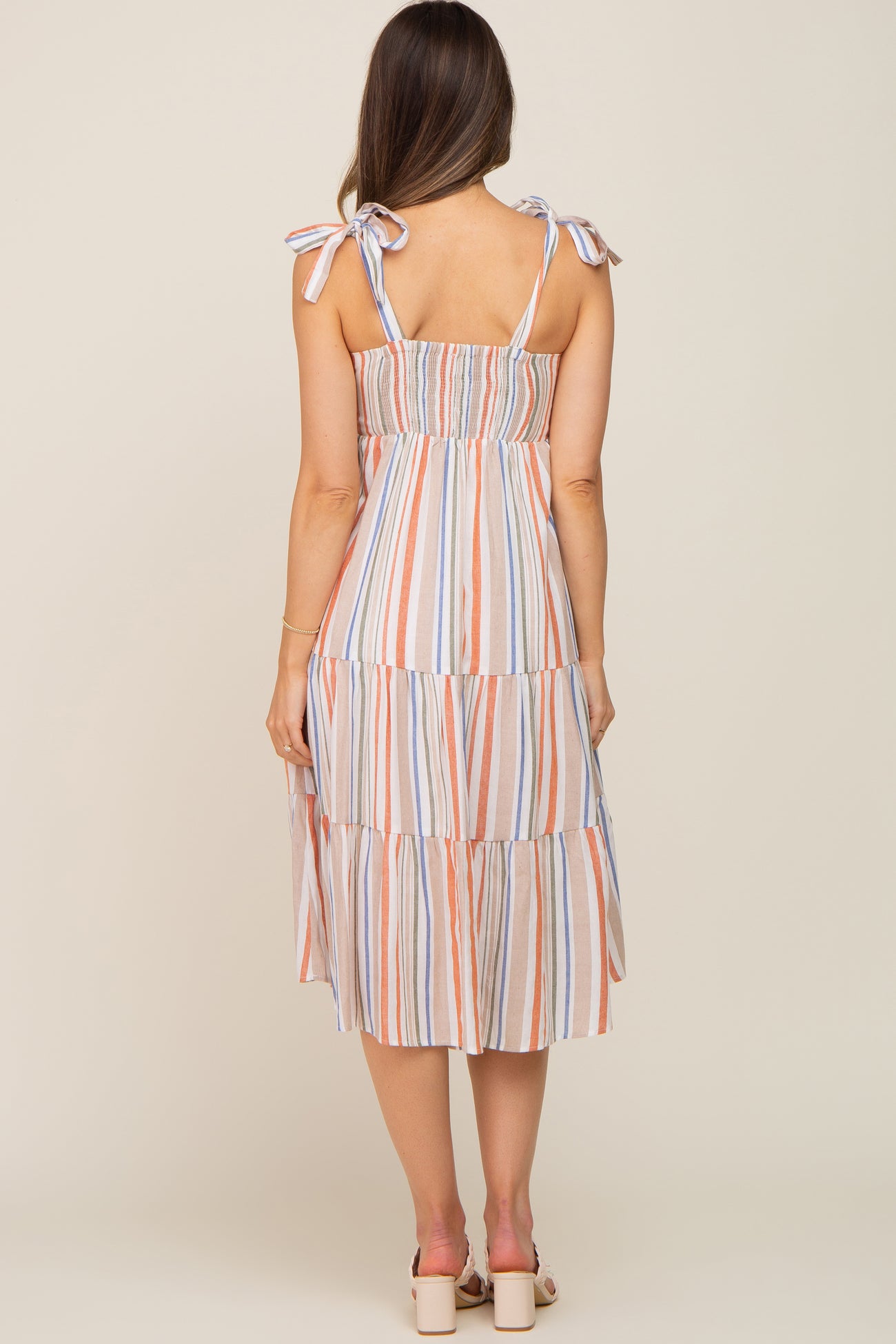 Rust Striped Shoulder Tie Tiered Maternity Midi Dress
