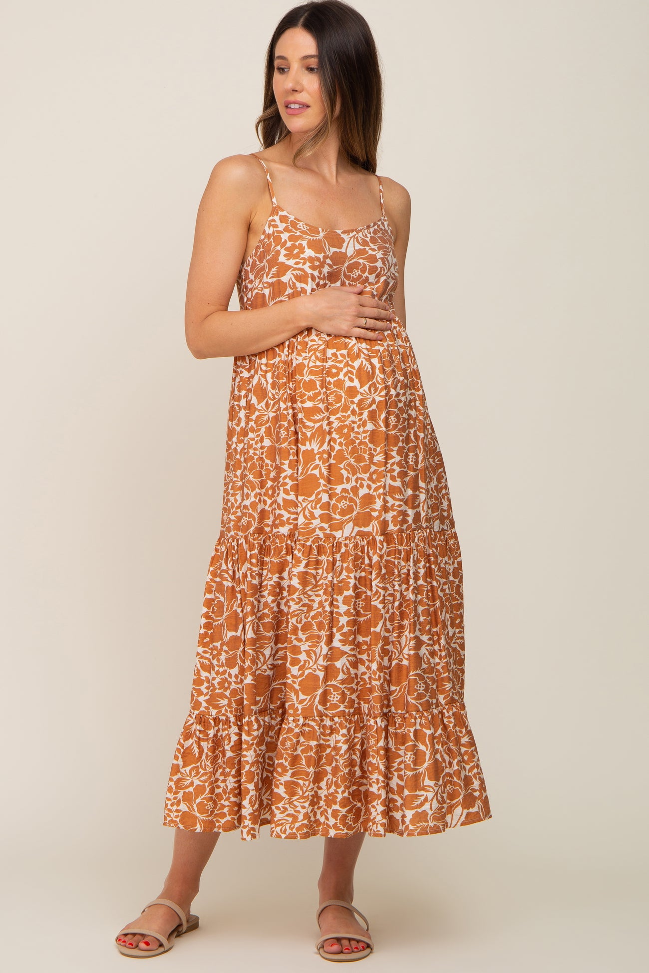 A floral print maternity midi dress with adjustable straps, smocked back and ruffle hem. Pocketed. Dress is partially lined.