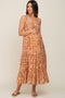 A floral print midi dress with adjustable straps, smocked back and ruffle hem. Pocketed. Dress is partially lined.