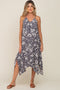 A floral midi dress with a v-neckline and a handkerchief style skirt with side slits.