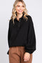 A solid pullover featuring long sleeves, front snap buttons and a collared neckline.