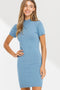 A knit fitted dress featuring a mock neckline and shirt fitted sleeves.
