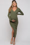 A solid ribbed fitted maxi dress featuring long sleeves, a side slit and a v-neckline.