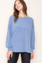A ribbed top with long sleeves, a rounded neckline, long drop shoulder sleeves, and side slits at the hem.