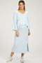 A knit maternity skirt set featuring a cropped top with a v-neckline and dropped shoulder long sleeves and a midi skirt with an elastic waistband.