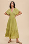 A solid hued midi dress featuring a smocked top, short flutter sleeves, a ruffle hem and a v-neckline.