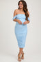 A mesh off shoulder maternity midi dress featuring mesh sleeves, and a ruched body.