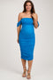 Details A mesh off shoulder maternity midi dress featuring mesh sleeves, and a ruched body. Content + Care