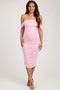 A mesh off shoulder maternity midi dress featuring mesh sleeves, and a ruched body.