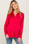 A solid hue button down top. Features a collar, functioning front buttons, long cuffed sleeves, and a rounded hi-lo hem.