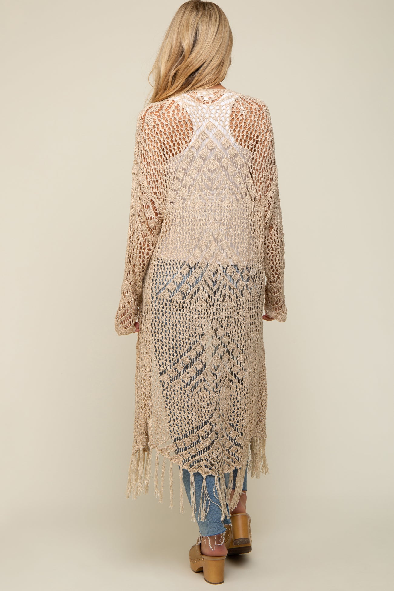 A crochet knit long maternity cardigan featuring long sleeves, an open front and crochet trim.