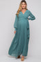 A solid maternity maxi dress with a deep v-neckline, long bubble sleeves, smocked detail on bust and waist, and front slit. Dress is double lined. Keyhole opening button closure in back.