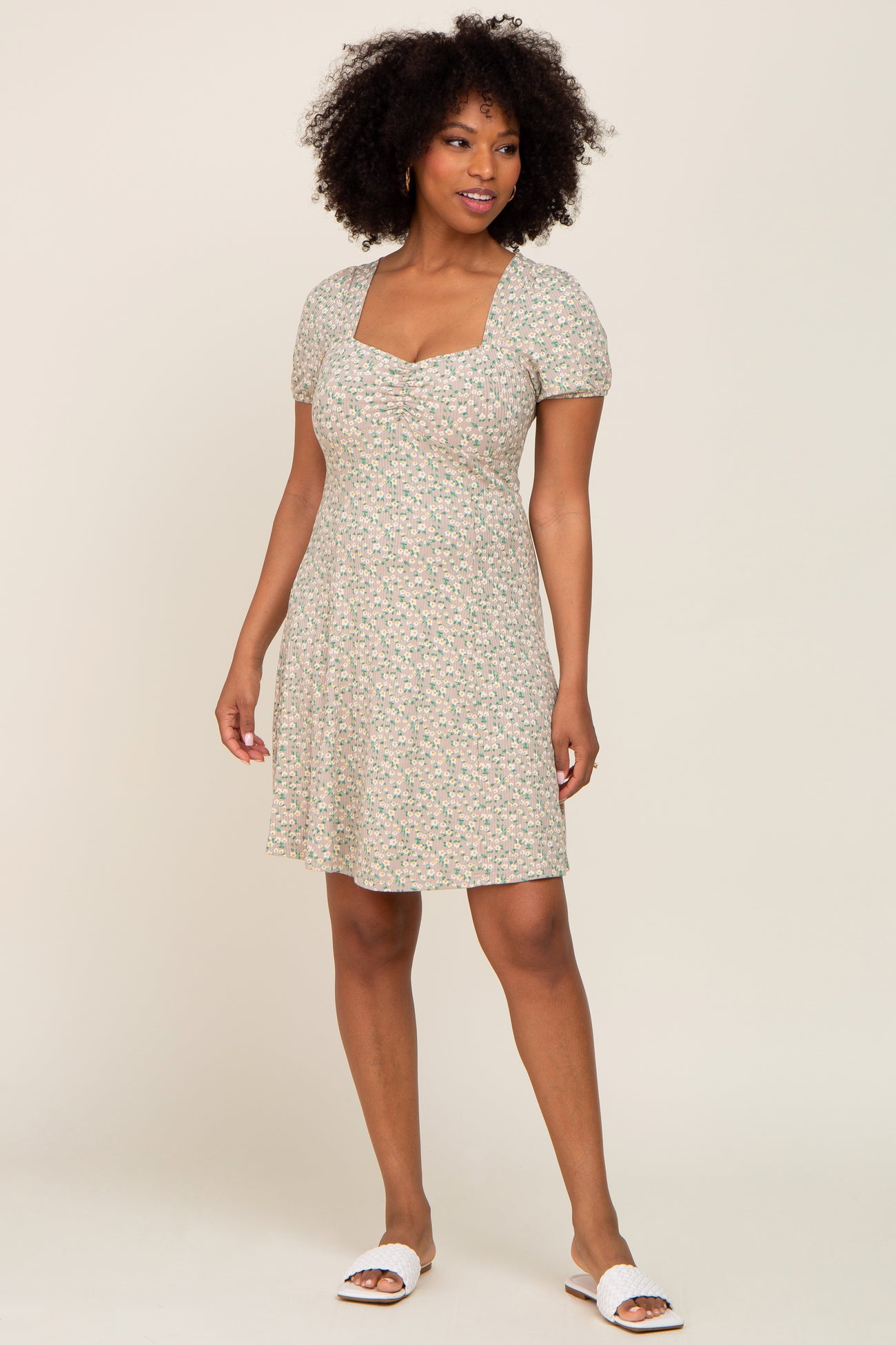 A floral print dress featuring a squared neckline, a front cinched bust, short sleeves, an a-line skirt, and a back criss-cross closure.