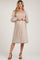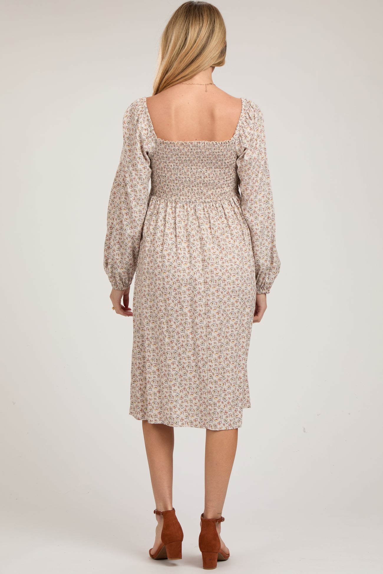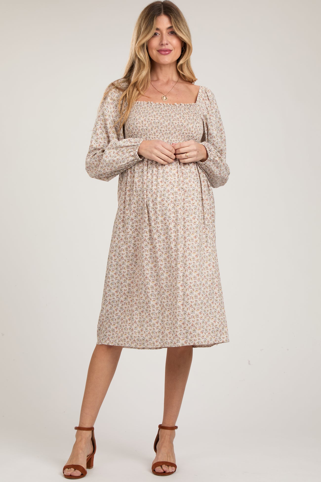 Beige Floral Print Long Sleeve Maternity Midi Dress