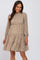 A floral print maternity dress featuring long sleeves, a mock neck, a shirred top, side pockets, and a button keyhole closure.