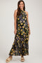A floral print maternity midi dress featuring a square neckline, a smocked bodice, 3/4 length puff ruffle sleeves, fringe trim and a ruffle hem.