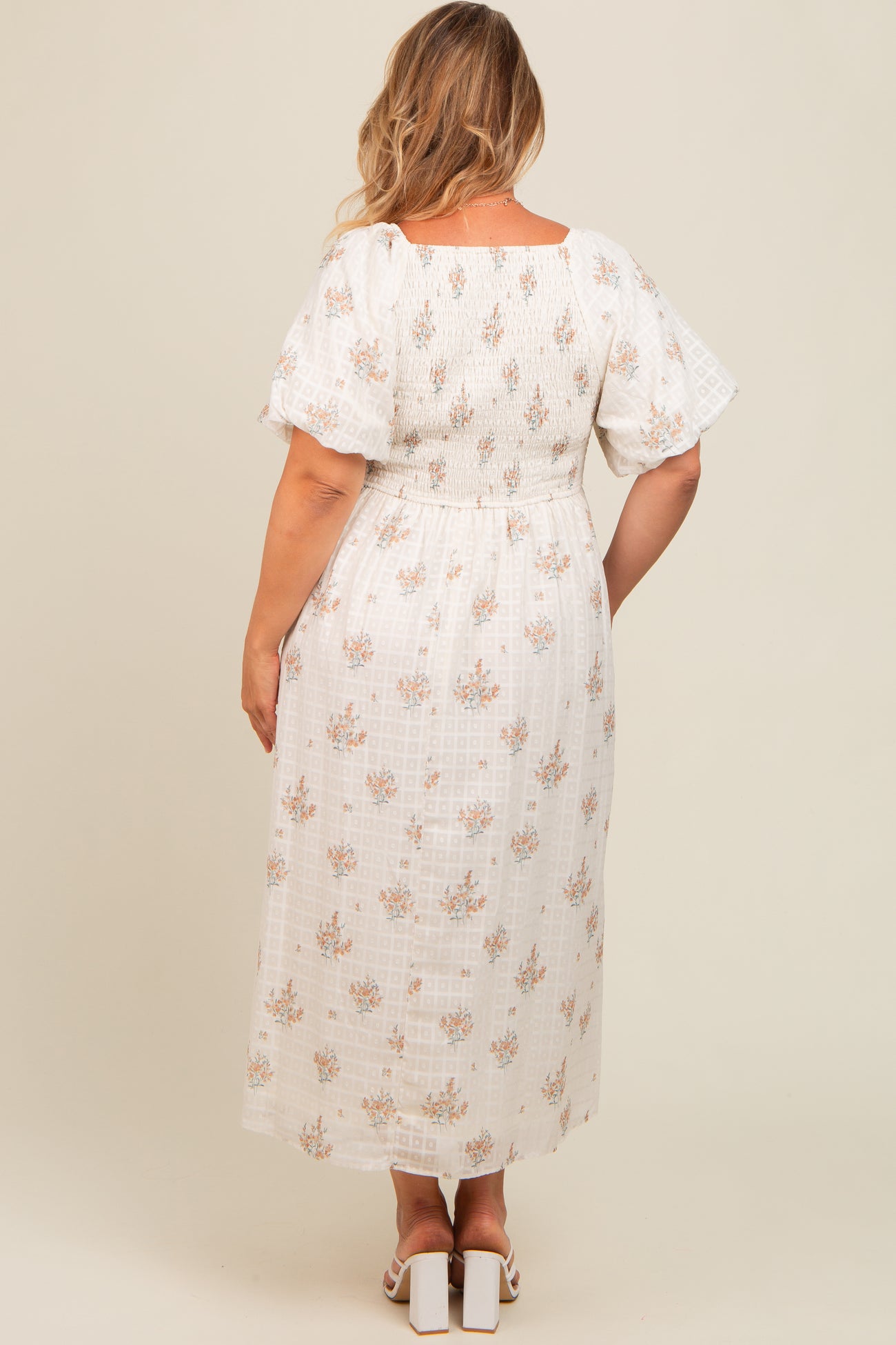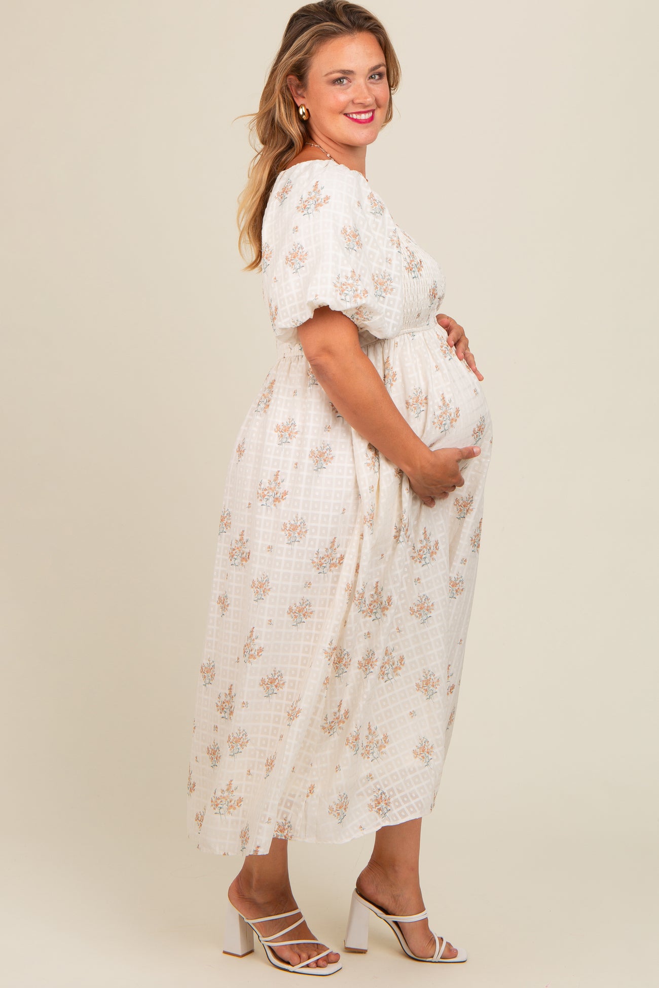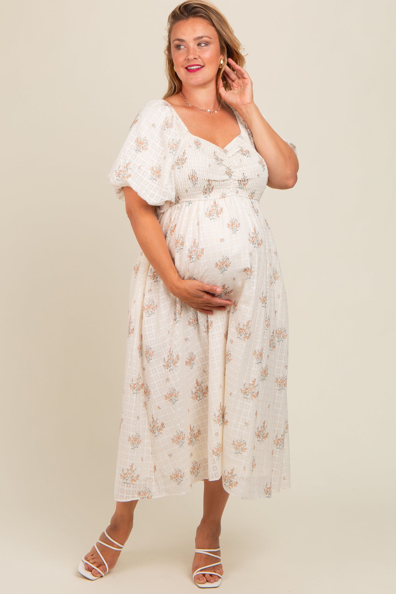 Beige Floral Textured Dot Smocked Sweetheart Neck Maternity Plus Midi Dress